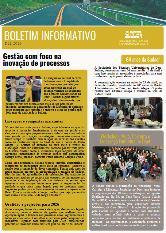 A Sociedade dos Técnicos Universitários do Daer, Sudaer, organizou o Boletim Informativo de 2025 descrevendo as principais atividades que marcaram o ano da entidade. O material foi entregue fisicamente a todos os associados e associadas juntamente com a última edição da Revista Estradas.